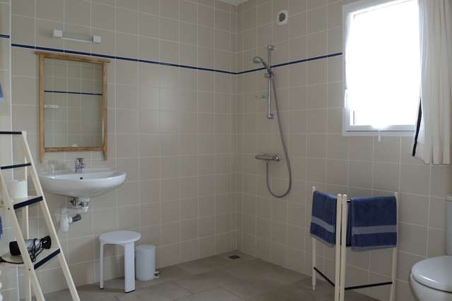 La chambre "Bord de Mer" (env 29m2 salle d'eau comprise) est décorée dans des tons blanc bleu et sable en accord avec la proximité de la mer, et est meublée de deux lits de 90X200. La salle de bain comprend une douche à l'italienne (sans bac ni cabine), un lavabo et un wc. Elle donne directement sur le jardin. Elle peut accueillir des personnes à mobilité réduite.
